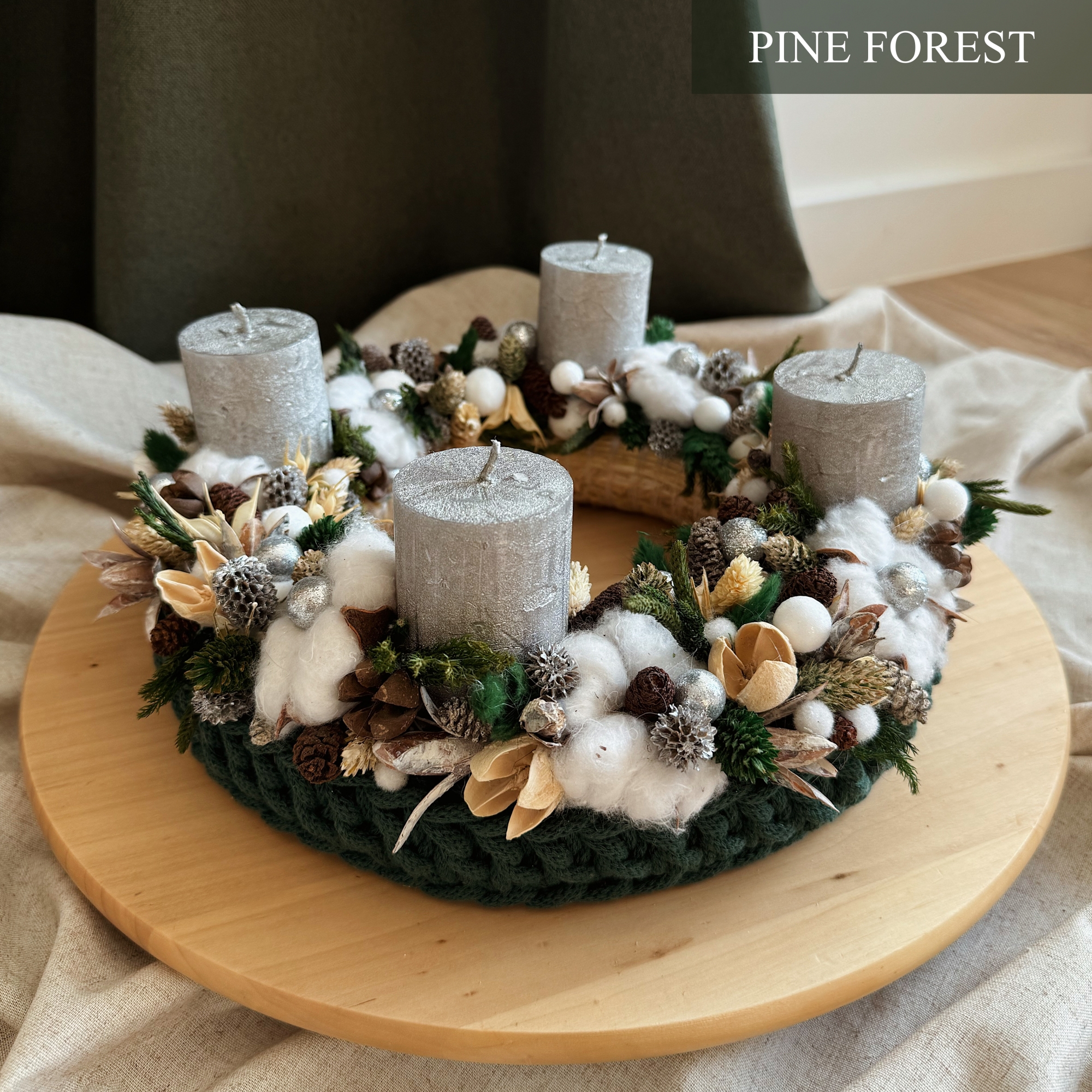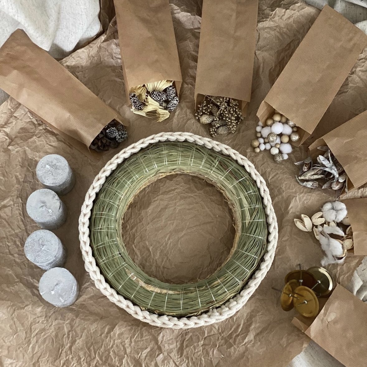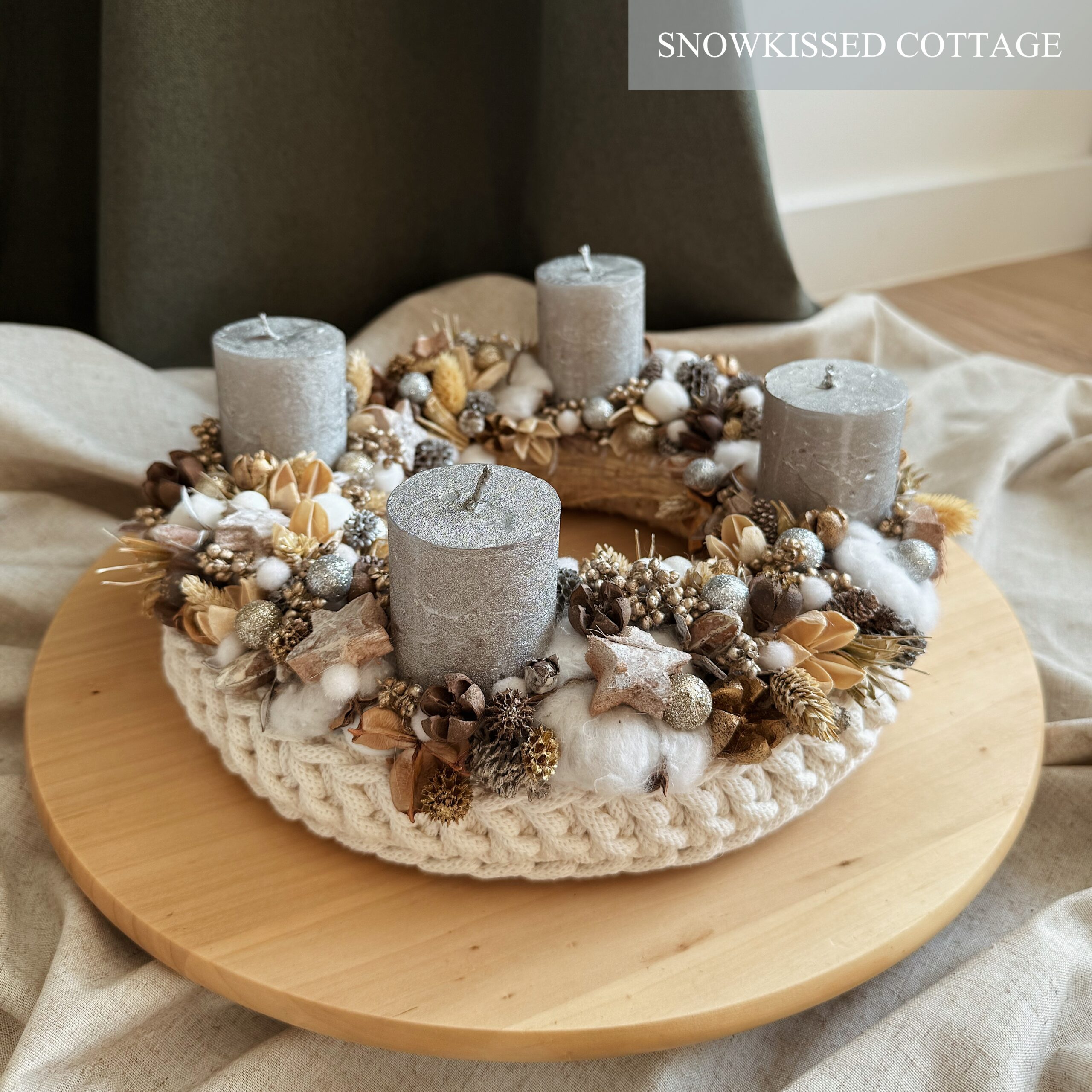 Minden szükséges kellék egy természetes stílusú adventi koszorú elkészítéséhez, 5 különböző színvilágban, kézzel készített, horgolt koszorúalapon.