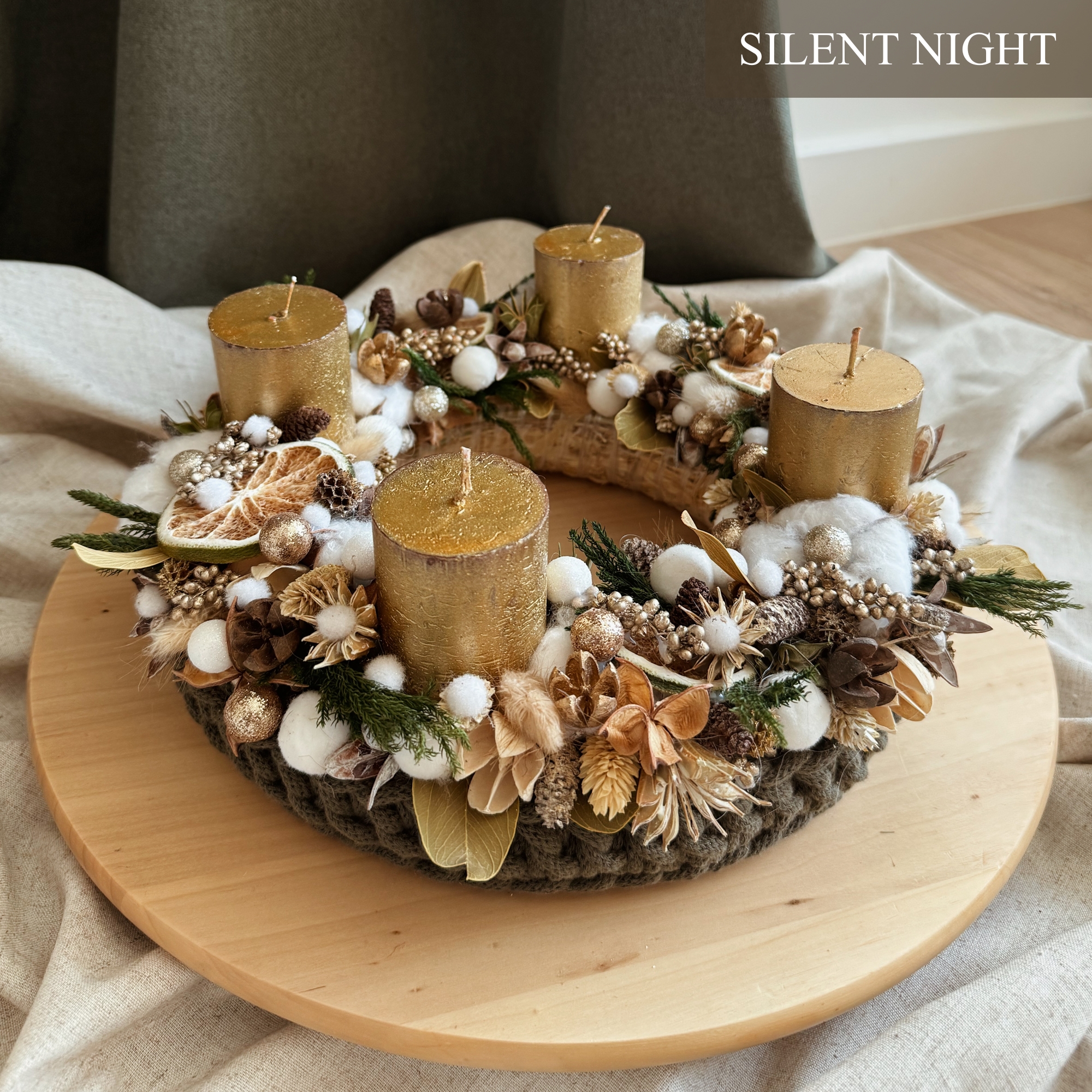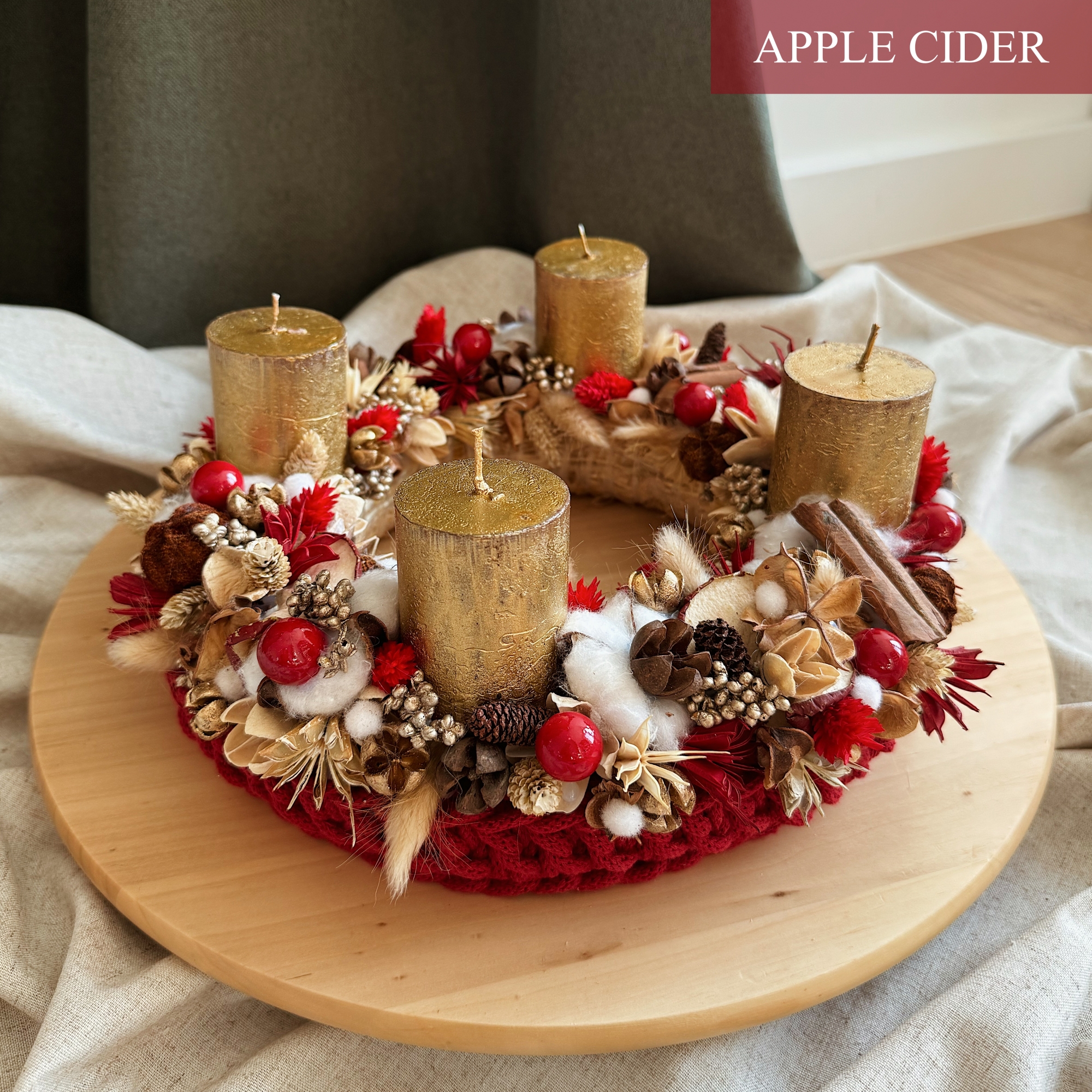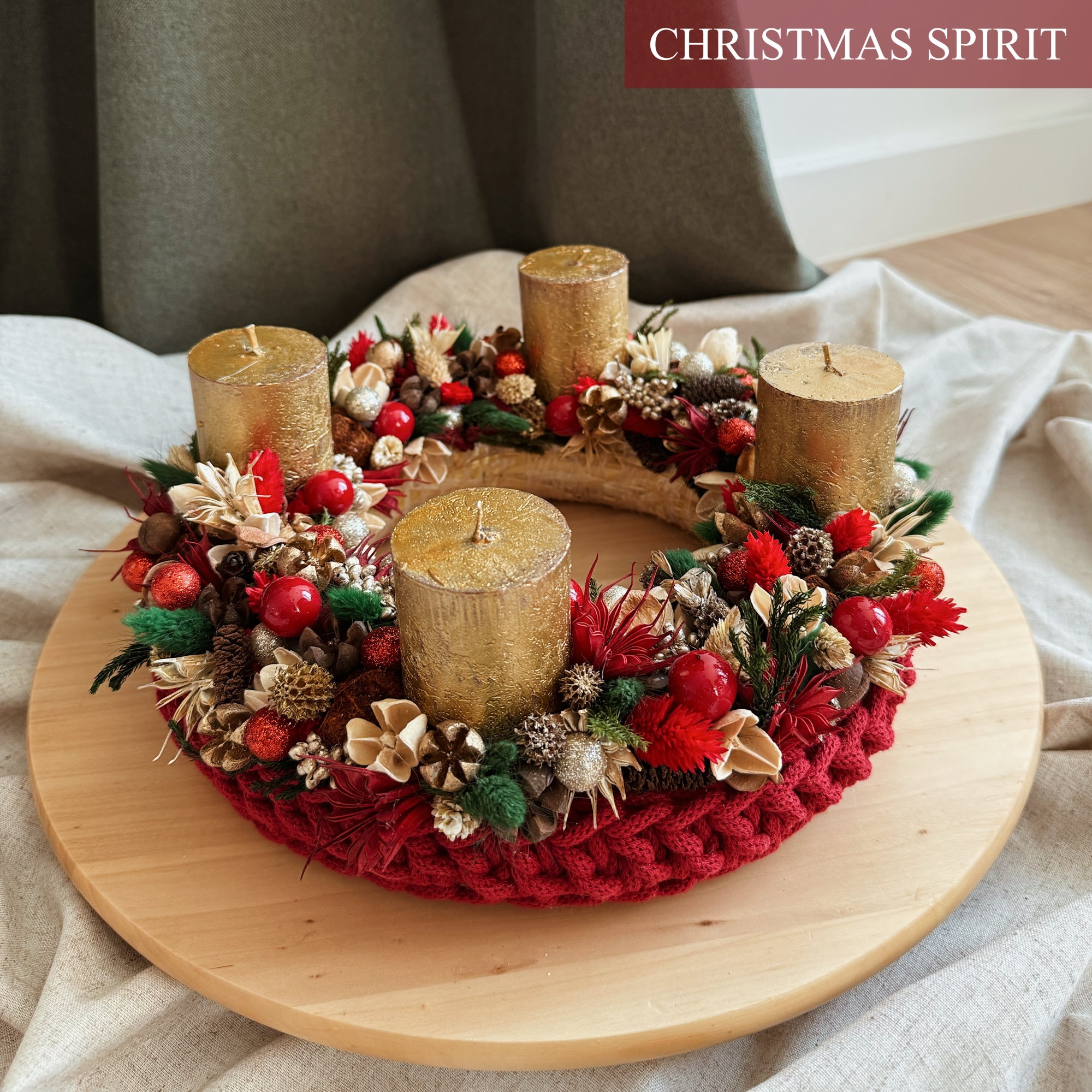 Minden szükséges kellék egy természetes stílusú adventi koszorú elkészítéséhez, 5 különböző színvilágban, kézzel készített, horgolt koszorúalapon.